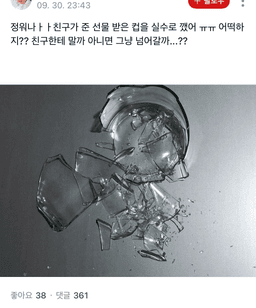 ![]() 일상 25.10.01 ??? : ㅁㅊ 어떡해 너가 선물로 준 컵 깨트렸어 ㅠㅠ | ![]() 가나디 | 34 | 7 |