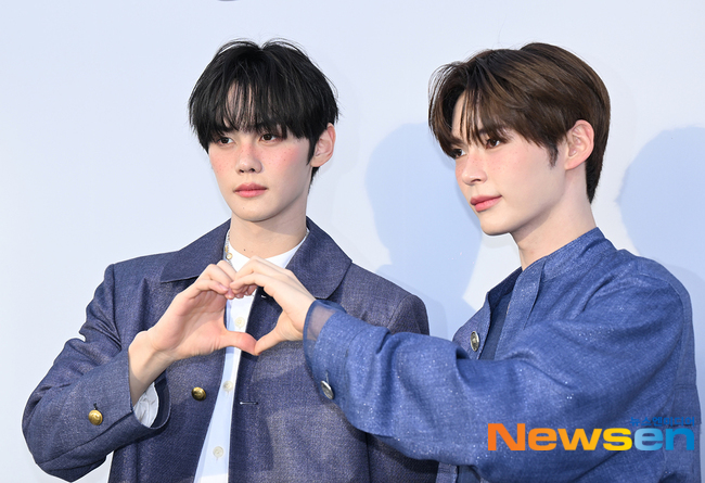 제로베이스원 김규빈, 성한빈이 9월 22일 오후 서울 종로구 광화문 광장 특설무대에서 열린 ‘미스지콜렉션 2026 S/S’ 블루밍 시즌 패션쇼 포토월에 참석해 포즈를 취하고 있다.